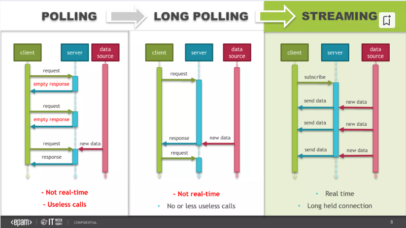 변경 사항이 불규칙적인 간격으로 일어나는 경우 효율적이나, 변경 사항의 빈도가 잦다면 기존 polling과 차이가 없으므로 서버의 부담이 증가하게 됨