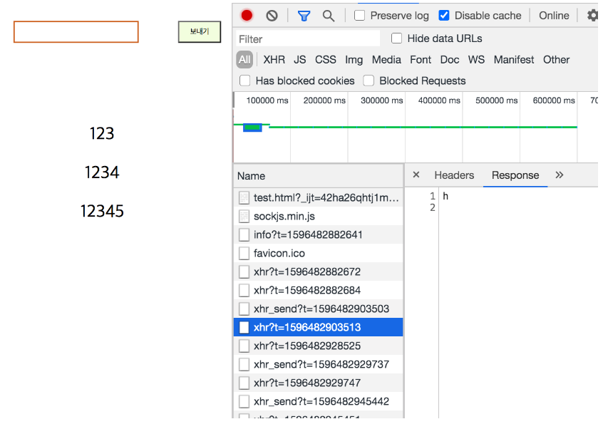 xhr-polling 타입 경우에는 서버에서 클라이언트로 응답 메시지가 전달이 될 때마다 기존의 커넥션을 종료하고 새로운 요청을 보내여 커넥션을 생성