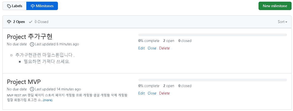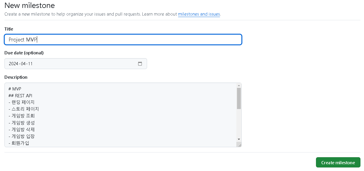 3. 마일스톤의 제목, 설명 또는 기타 변경 내용을 입력하고 마일스톤 만들기 또는 변경 내용 저장 클릭