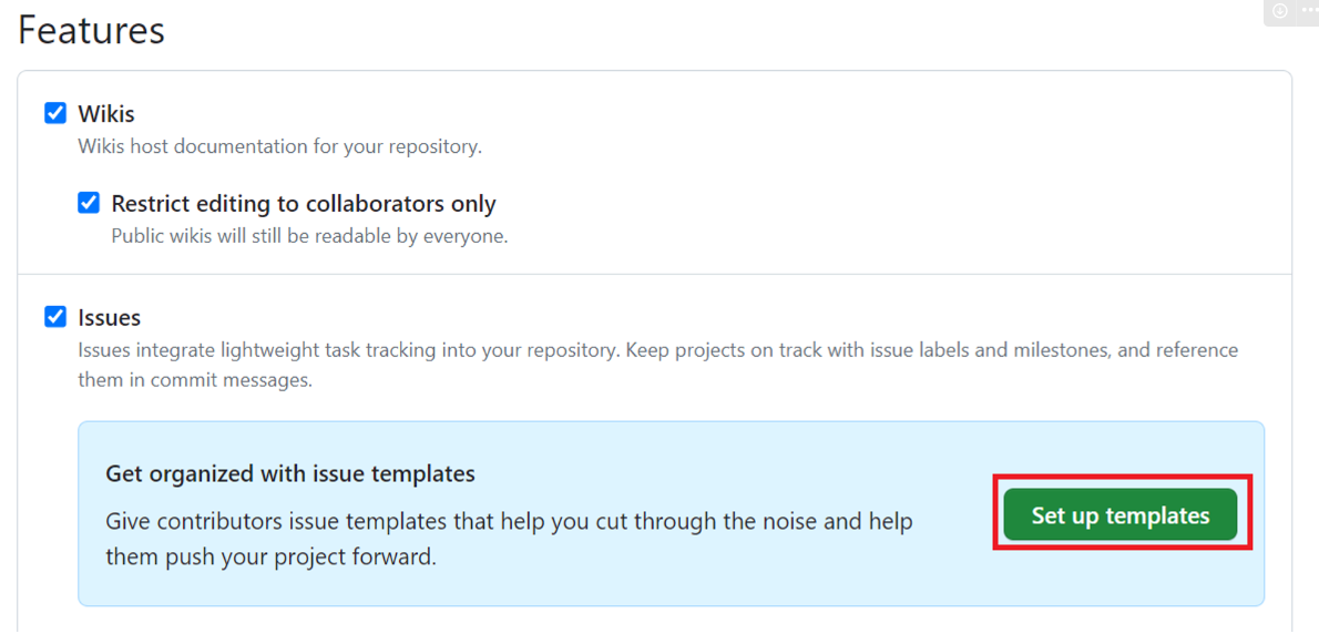 2. General 탭의 스크롤을 내려 Features → Issues → Set up Templates