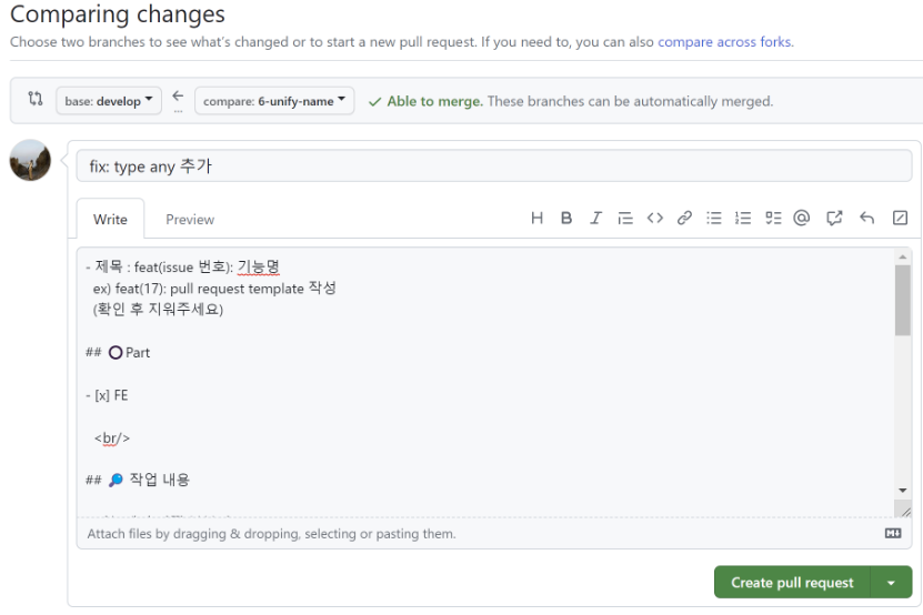 4. Pull Request 요청 시 Template 선택하여 작성(1개일 경우 자동적으로 적용)