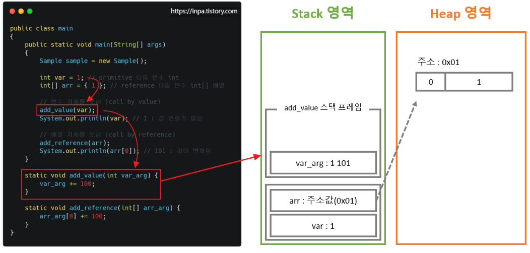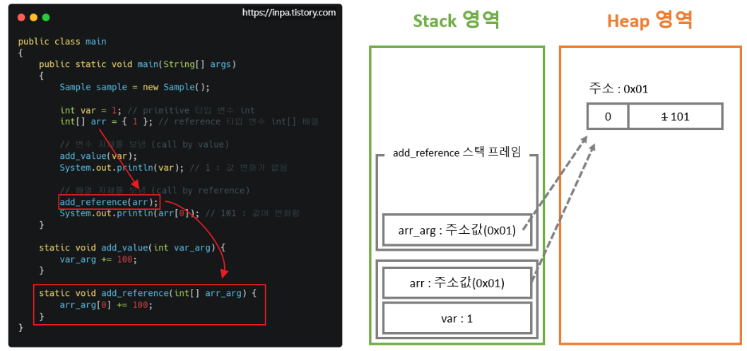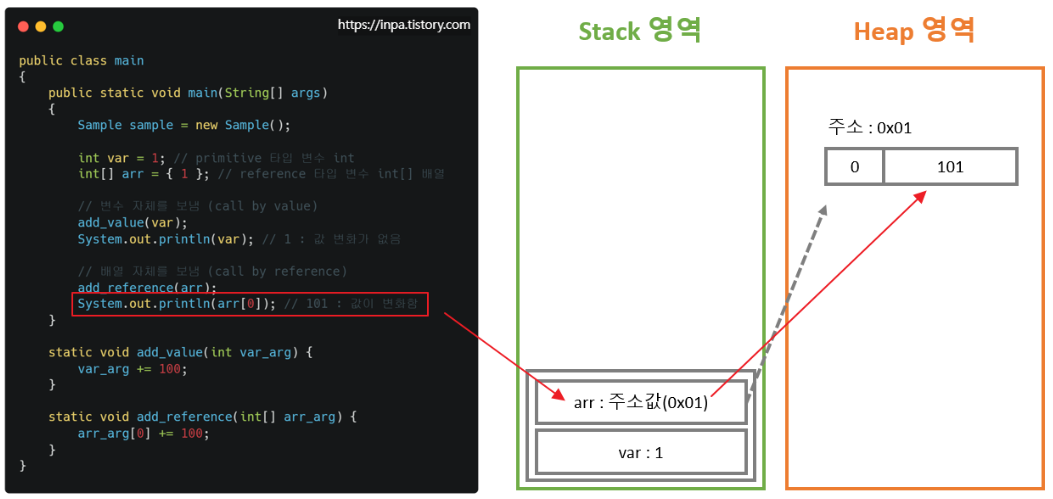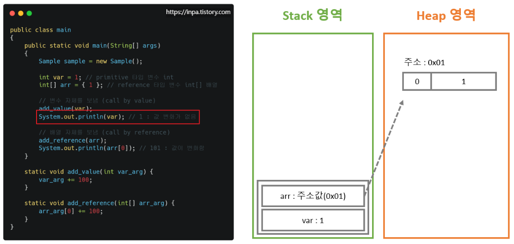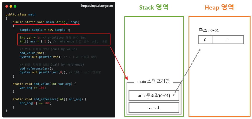 primitive 타입인 변수 var은 그대로 원시값 1을 지니게 되며, reference 타입인 변수 arr의 실제 데이터는 heap 영역에 저장되게 되고 이를 참조할 주소값을 저장하게 됨
