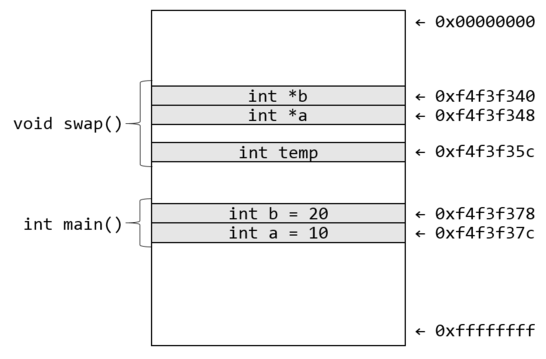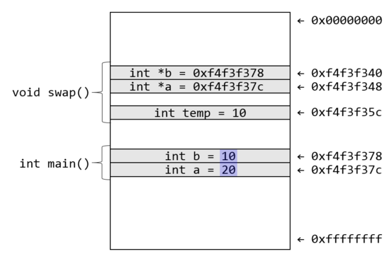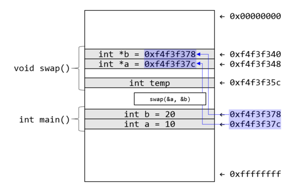 이때 입력값으로 변수 a, b를 주소연산자를 이용해 &a, &b로 주소를 인자값으로 넘기기 때문에 swap() 함수가 호출되면, 다음과 같이 swap() 함수의 포인터 매개변수 *a, *b에 주소값들이 대입된다.